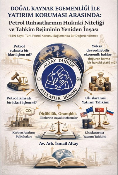 Petrol ruhsatı, hukuki güvenlik, meşru beklenti, enerji dönüşümü, dolaylı kamulaştırma, yatırım tahkimi, uluslararası yatırım hukuku, 6491 sayılı Türk Petrol Kanunu, karma hukuki statü, devlet egemenliği, ICSID, ECT.